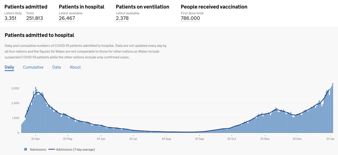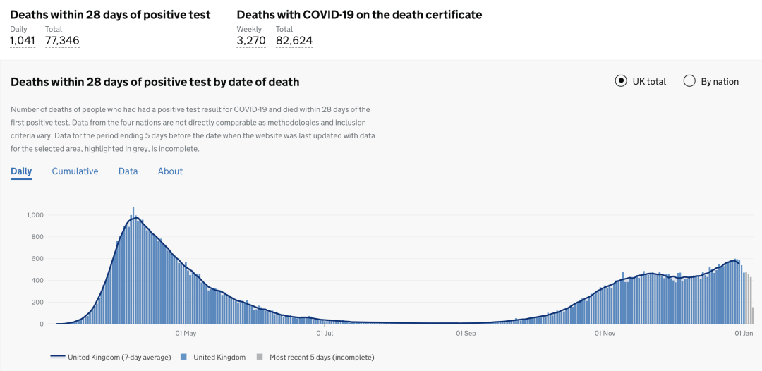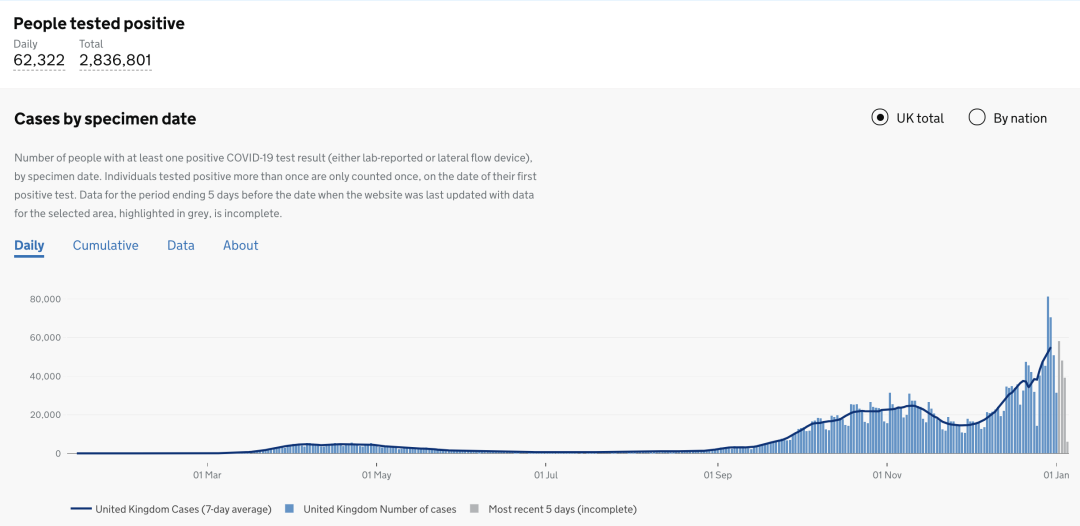 截止至2021年1月6日(周三)英国时间09:00,累计检测结果量54,808,079次(+498,624);累计确诊2,836,801例(+62,322);累计病亡77,346例(+1,041)。