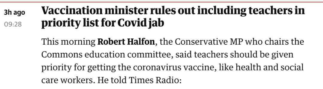 担任下议院教育委员会主席的保守党议员Robert Halfon表示,教师应该像卫生和社会护理人员一样,优先获得新冠病毒疫苗接种权。