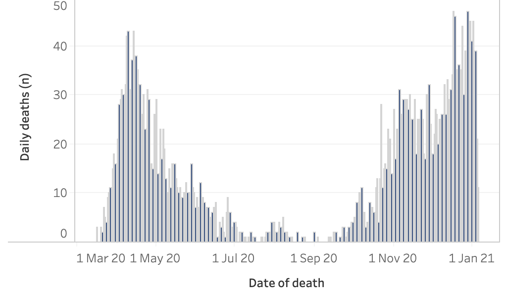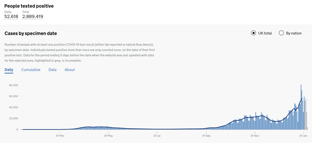 截止至2021年1月7日(周四)英国时间09:00,累计检测结果量55,378,721次(+557,441);累计确诊2,889,419例(+52,618);累计病亡78,508例(+1,162)。