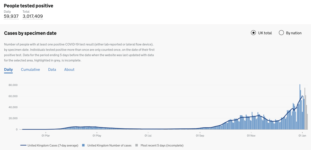 截止至2021年1月9日(周六)英国时间09:00,累计检测结果量56,003,851次(待更新);累计确诊3,017,409例(+59,937);累计病亡80,868例(+1,035)。