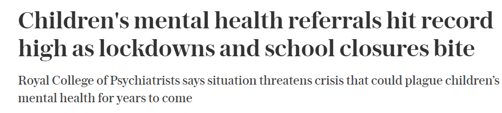 一所皇家学院警告说,儿童因严重的心理健康问题而被转诊到国家医疗服务系统(NHS)的人数已经创下历史新高。新冠疫情有可能导致一代人患上“终身疾病“。