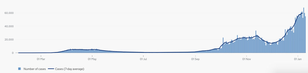 截止至2021年1月10日(周日)英国时间09:00,累计检测结果量56,003,851次(待更新);累计确诊3,072,349例(+54,940);累计病亡81,431例(+563)。