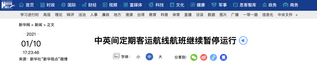 中国民航局1月10日发布公告,为进一步妥善应对英国变异新冠病毒可能对疫情防控工作带来的影响,自北京时间2021年1月11日零时起,继续暂停中英间定期客运航线航班运行。
