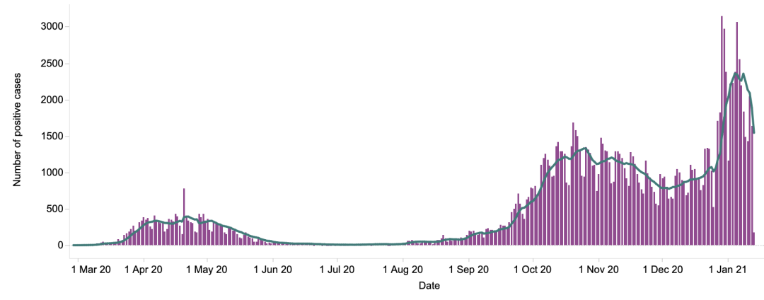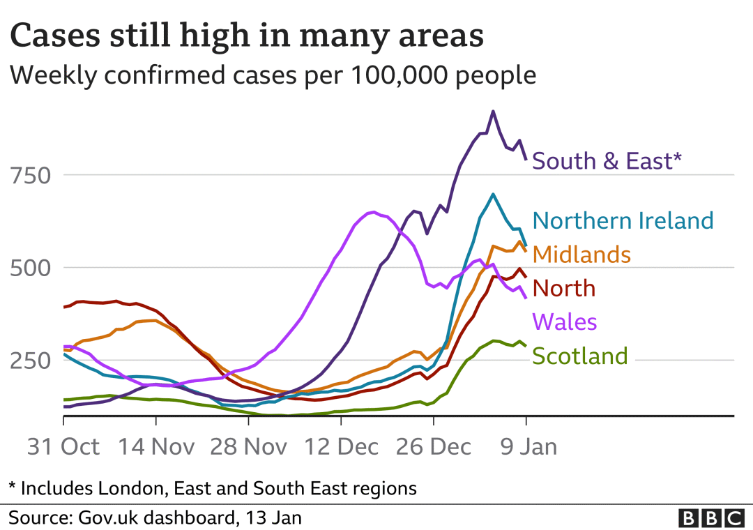 1月14日(周四),近期数据显示——英国的入院人数也抵达了拐点:官方表示新冠疫情的增长速度正在放缓,在一些NHS地区,新增确诊和入院人数已经停止了增长。