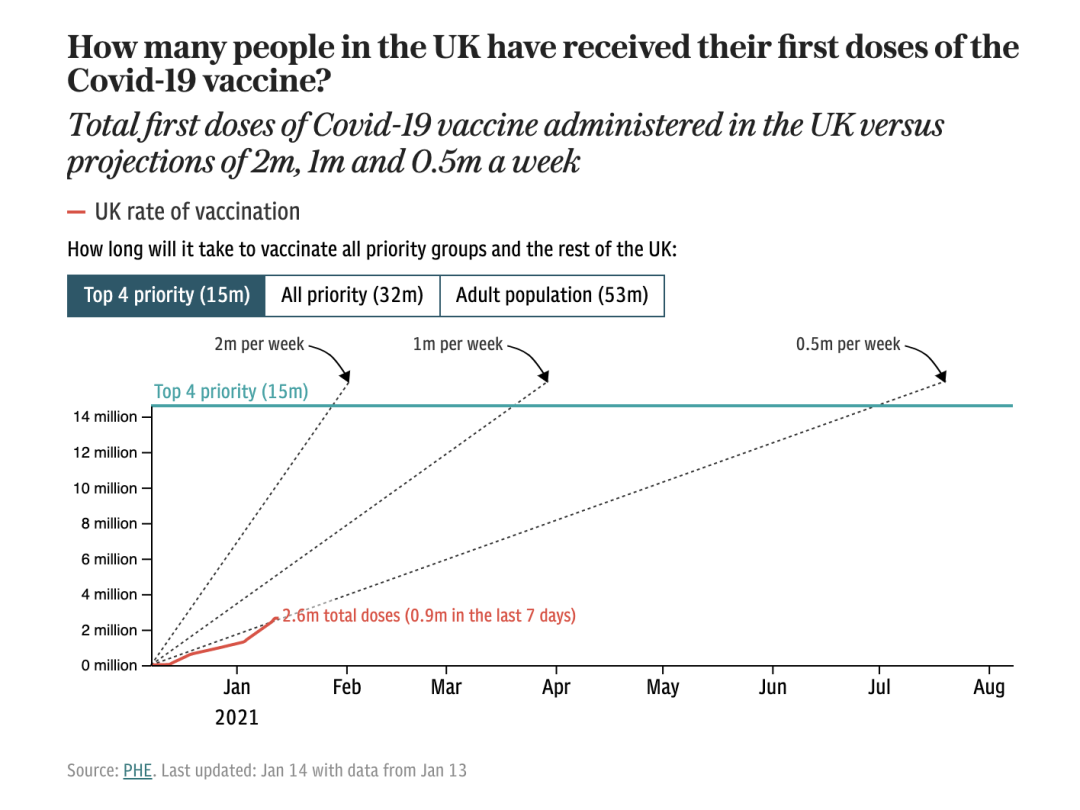 那么目前英国疫苗接种速度如何呢?据悉,英国政府需要实现每周约200万支疫苗的接种,才能达到2月份的预期目标。