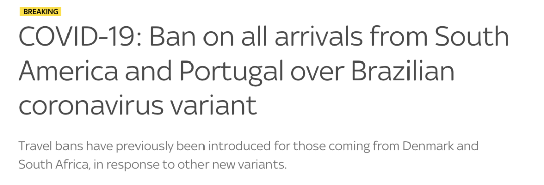 1月14日(周四),英国官方宣布:由于对巴西新冠病毒变种的担忧,从所有南美洲国家以及葡萄牙前往英国的旅行将于1月15日(周五)04:00起被禁止;此外,Panama and Cape Verde也将被列入英国政府新冠委员会的部长们周四决定的禁令中。