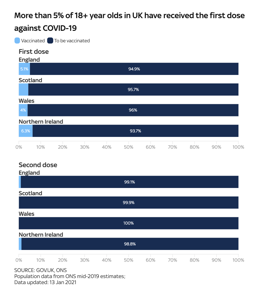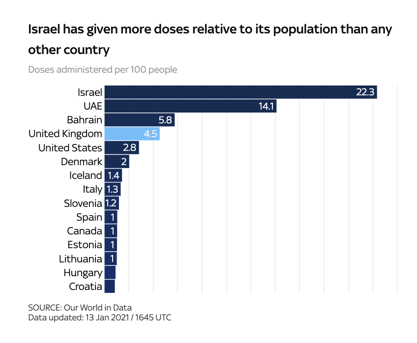 截至1月13日(周三),在全球范围内,以色列的疫苗接种量超过了其他任何国家——22.3%的接种率。而英国目前排名第四:4.5%。