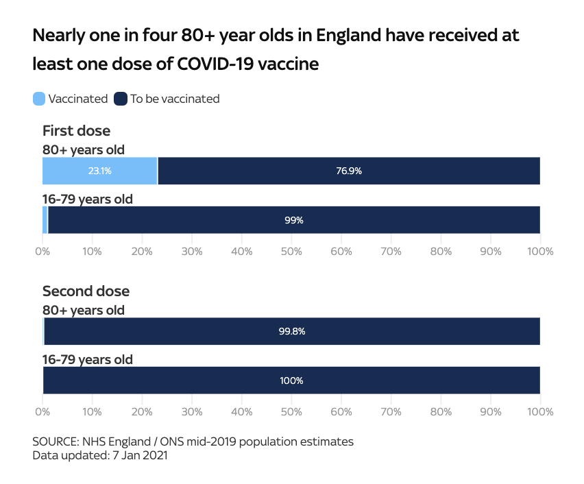 截至2021年1月7日(周四),英格兰80岁+群体已经有23.1%接种了首剂疫苗。