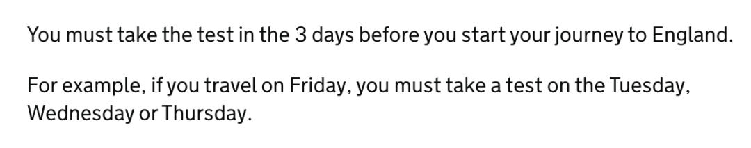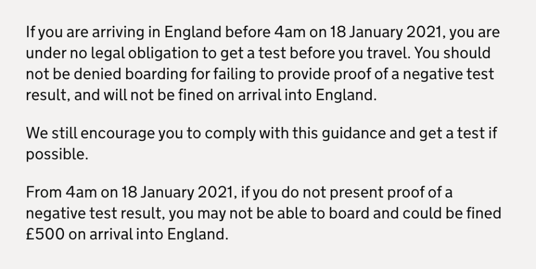 据悉,今日官方正式更新:从2021年1月18日(周一)早晨4:00起,前往英国的旅客需要提供登机前3日内的核酸检测阴性证明。
