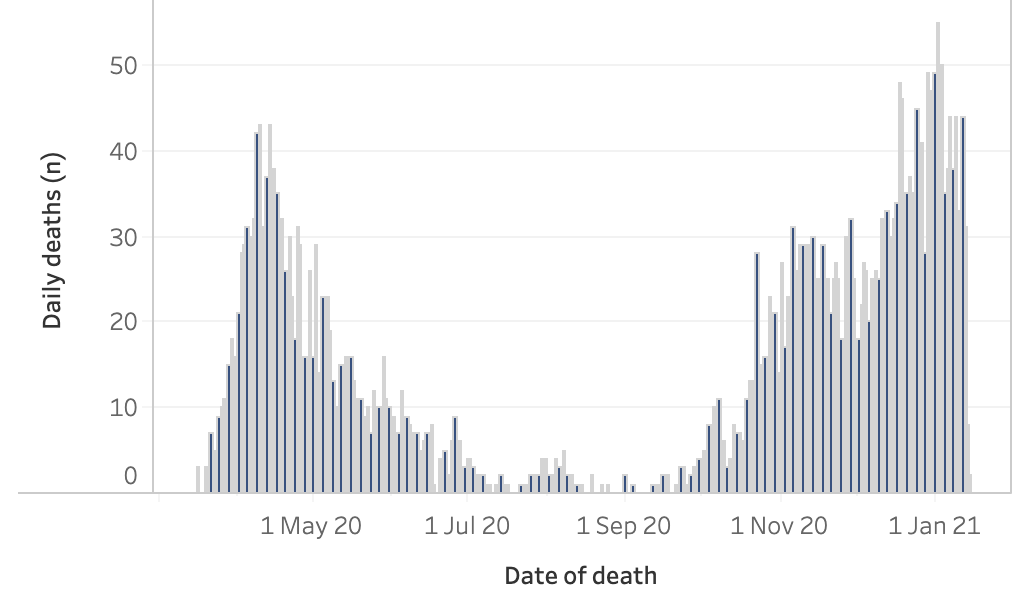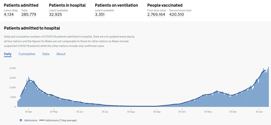 英国全境截止今日,已接种第1剂疫苗共3,234,946人(+316,694);已接种第2剂疫苗共443,234人(+5,255)。