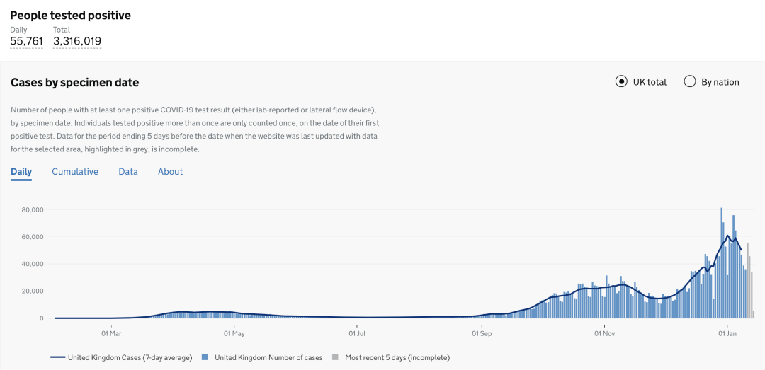 截止至2021年1月15日(周五)英国时间09:00,累计检测结果量60,0242,686次(+695,148);累计确诊3,316,019例(+55,761);累计病亡87,295例(+1,280)。