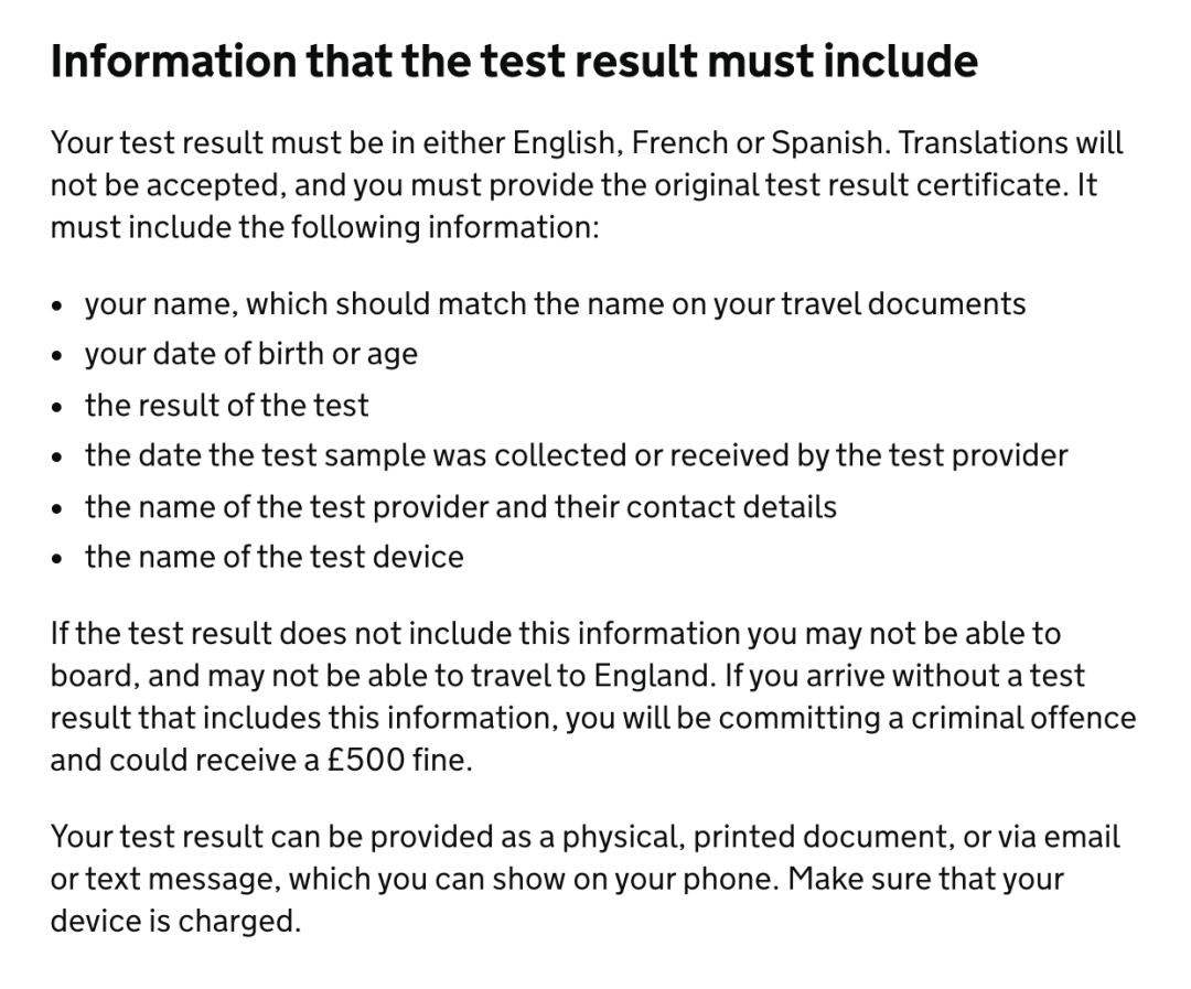 若检测结果不包括这些信息,可能无法登机,也无法前往英国。如果在抵达时没有提供包含这些信息的检测证明,英国将视为刑事罪,并且可能会被处以£500的罚款。