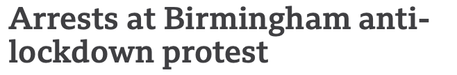 周六(1月16日)下午,大批示威者聚集在伯明翰市中心Bullring附近进行反封锁示威活动。人群中仍有未戴口罩的抗议者与警察发生冲突。其中11人因是无视新冠病毒封锁法律和安全建议被捕。