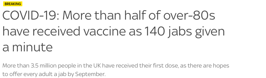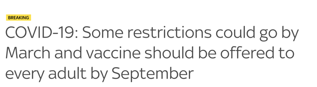 同时,英国外交大臣Dominic Raab表示,政府预期的目标是在9月前保证所有成年人能够打上第一剂新冠病毒疫苗, 这也是政府预计的最晚日期,如果条件允许将会提前完成该计划。