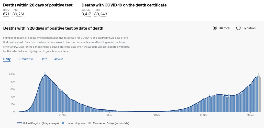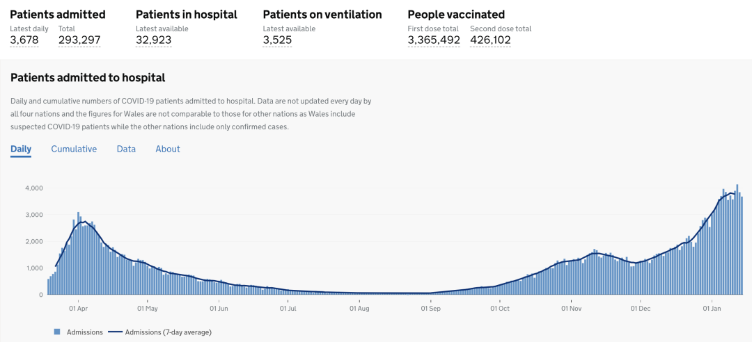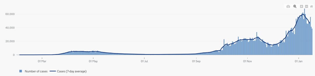虽然英国目前的接种人数已经超过了确诊人数,但最近的确诊病例和死亡人数依在激增,这也促使了政府在前一段时间施行了更严厉的封锁措施。