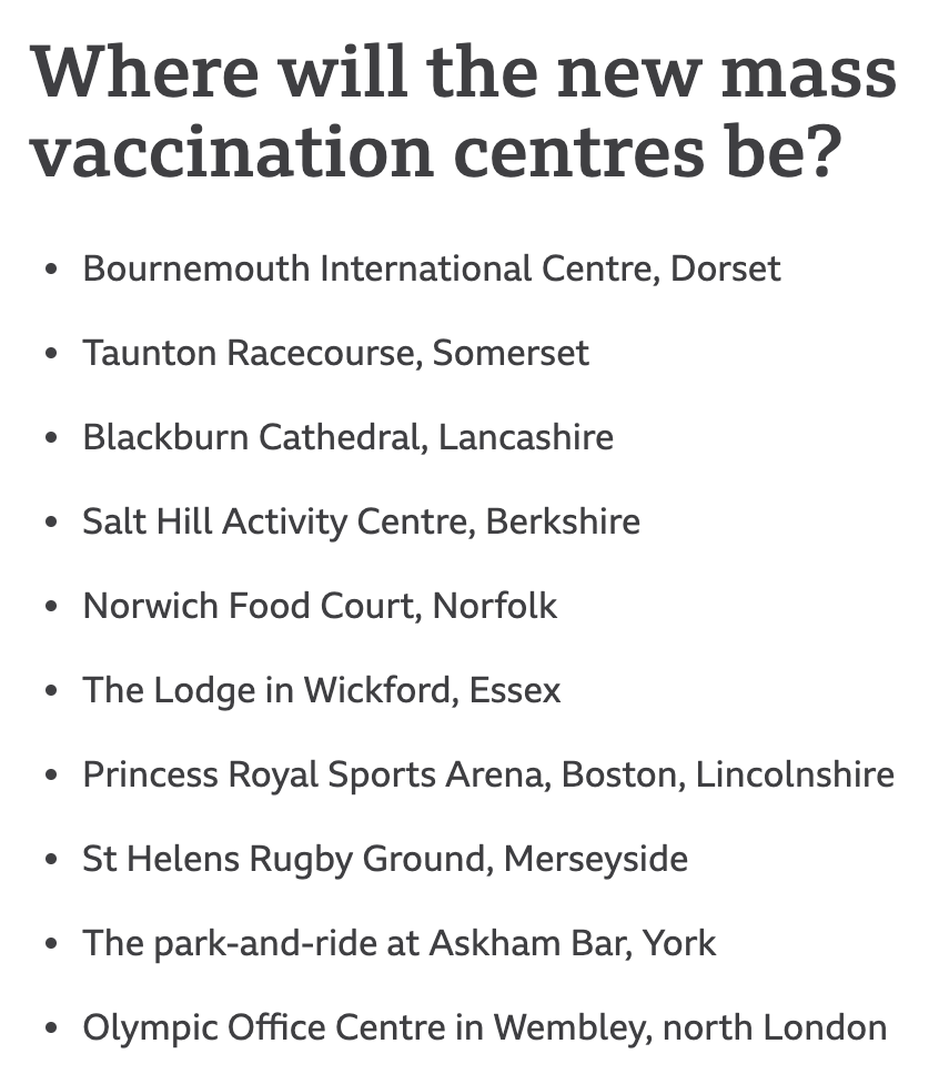 加上英国目前已经开放的七个疫苗接种中心,下周英国运行中的大型接种中心总数将会达到17个。
