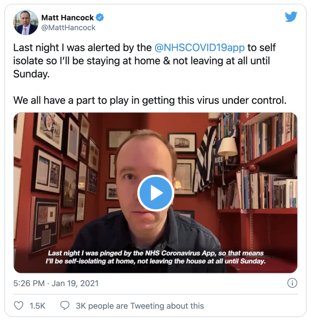 1月19日(周二),英国卫生部长Matt Hancock表示,在受到英国NHS Covid-19手机app的提醒后,他再次正式进入自我隔离阶段。