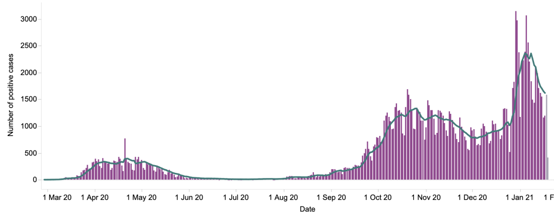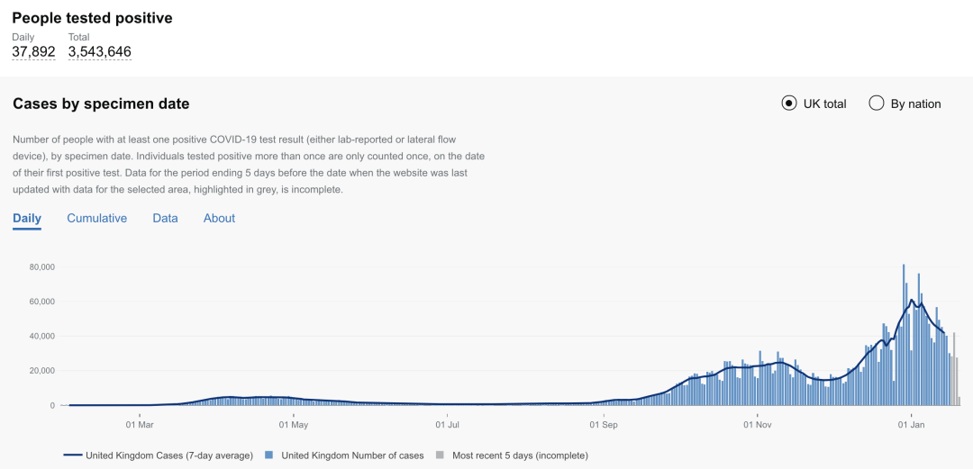 截止至2021年1月21日(周四)英国时间09:00,累计检测结果量63,623,219次(+640,856);累计确诊3,543,646例(+37,892);累计病亡94,580例(+1,290)。