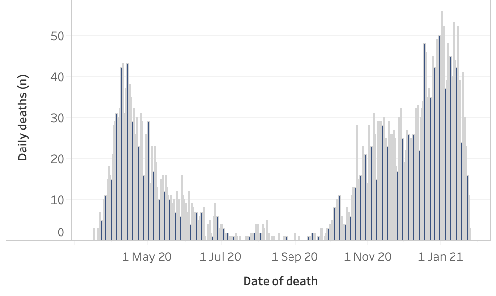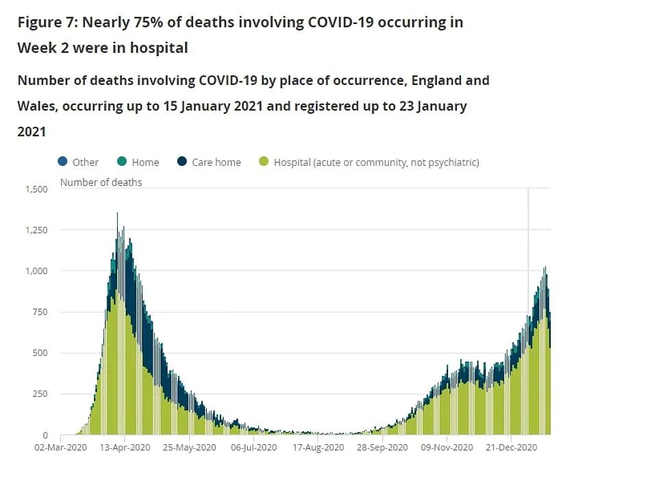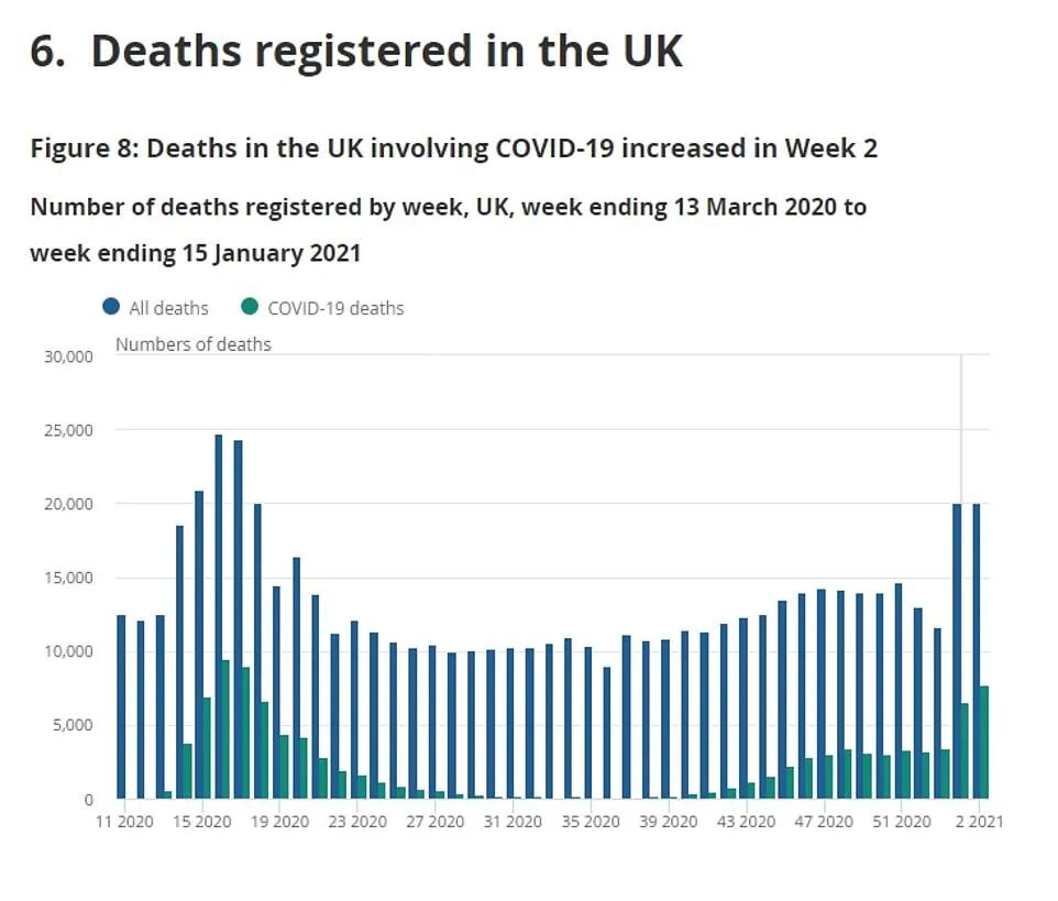 英国国家统计局ONS今日透露,在截至1月15日的一周内,英格兰和威尔士的病亡人数当中每10人中就有4人死于新冠肺炎。自新冠疫情爆发以来,新冠病亡的总人数已破10万人。