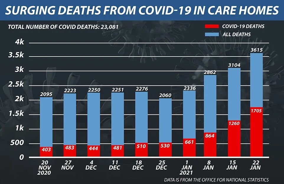 据悉,在英格兰和威尔士的新冠病毒死亡总数中,养老院的居民几乎占了三分之一。截至2021年1月15日,共有30,851名居民死于该病毒。