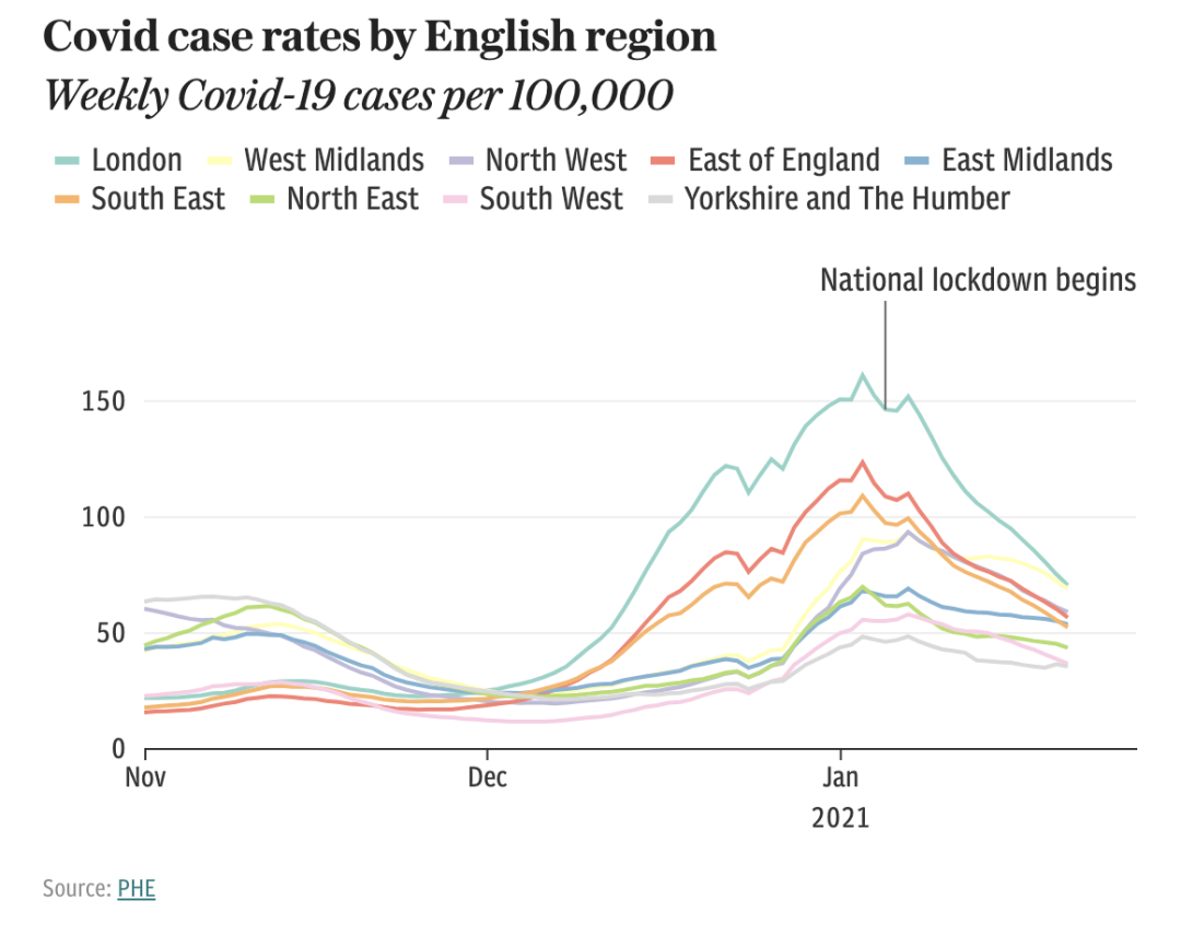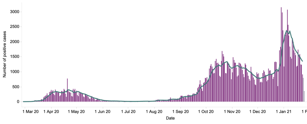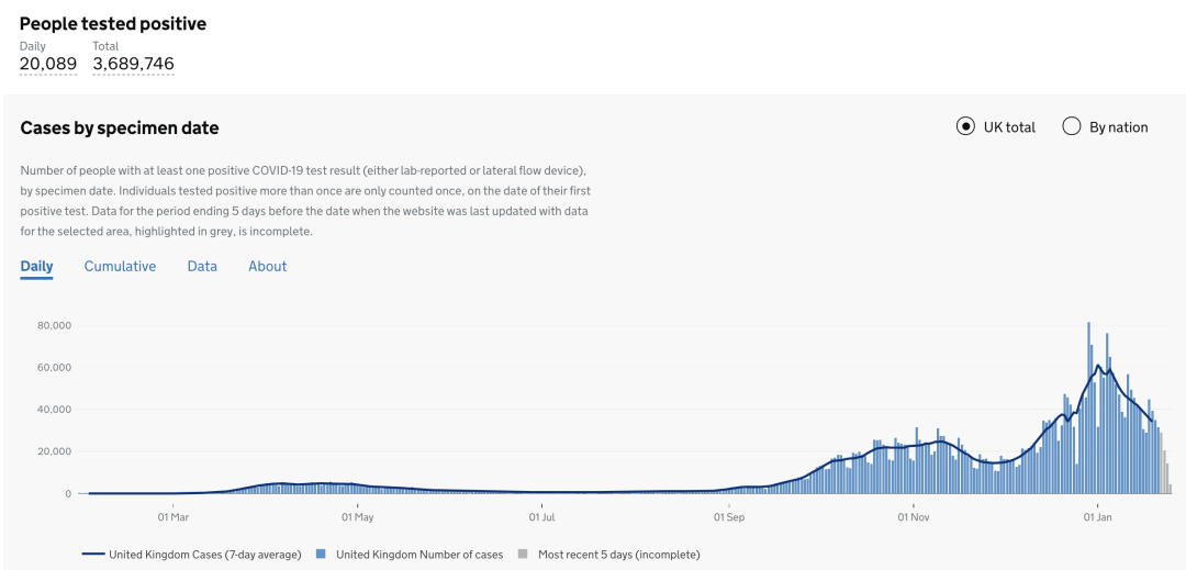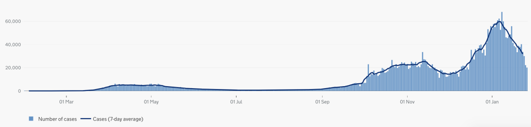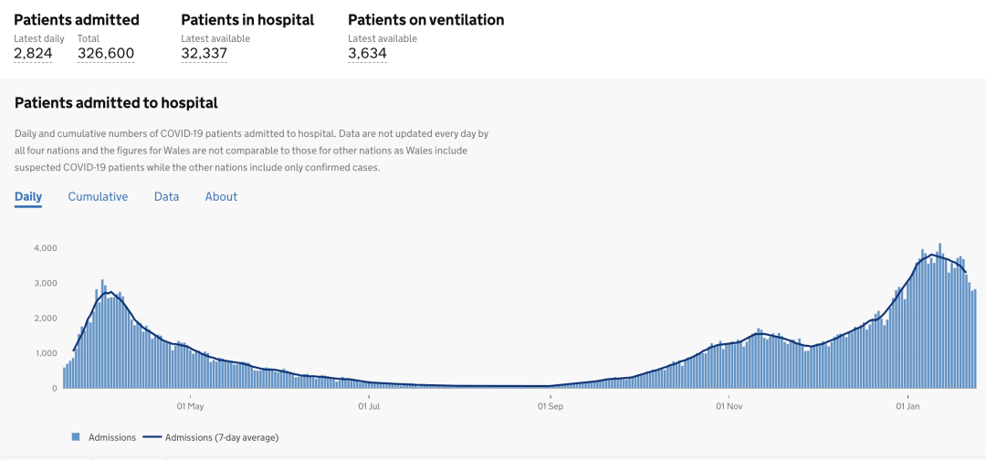 不过好消息是,自年初以来,感染新冠病毒的人数一直在下降,NHS Test & Trace现在平均每天接诊33,738例,低于1月8日高峰期的59,660例。而全国各地的新入院人数也开始下降,从1月9日前后一周的每日4,221人下降到1月18日的3,863人。