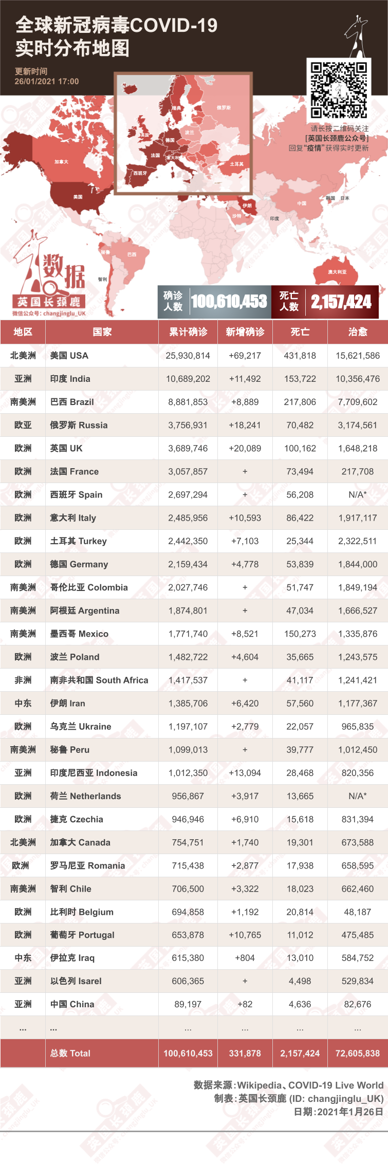 世界的累计确诊人数截止1月26日17:00超过10,061万例(+990k),死亡超过215.7万例(+12k)。