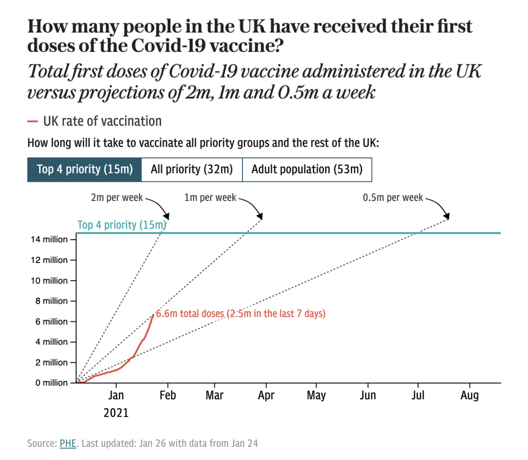截至1月26日,根据英格兰公共卫生部PHE数据显示:英国的平均疫苗接种速度达到了100万剂每周,按此速度将在3月中旬完成对1,500万脆弱人群首剂疫苗的接种。