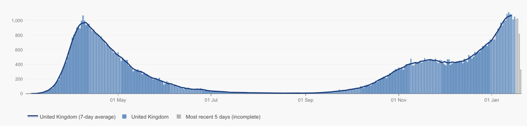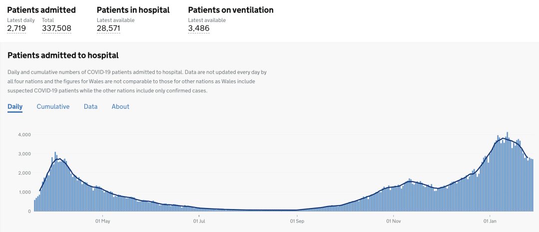 英国全境截至今日,已接种第1剂疫苗共8,977,329人(+598,389);已接种第2剂疫苗共491,053人(+10,621)。