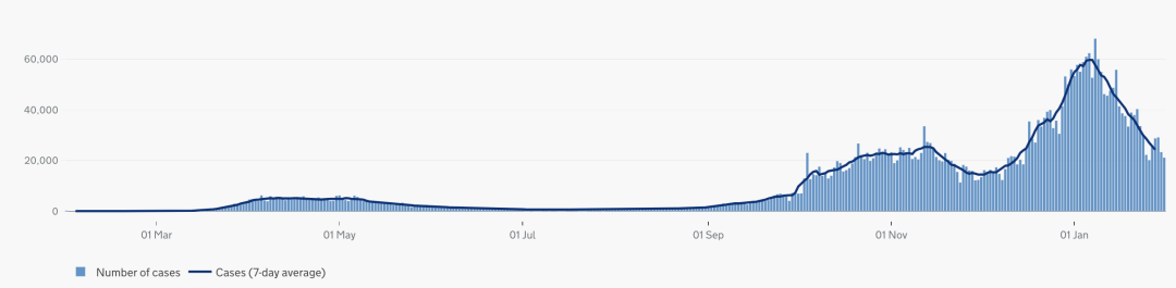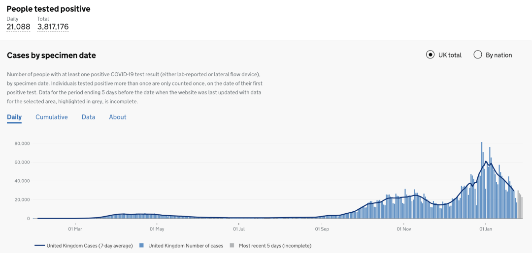 截止至2021年1月31日(周日)英国时间09:00,累计检测结果量68,606,924次(待更新);累计确诊3,817,176例(+21,088);累计病亡106,158例(+587)。