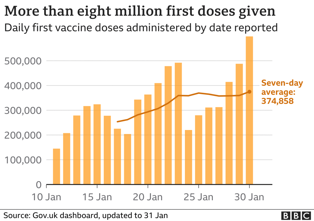 英国设定的2月15日目标——为护理院的居民、护理人员、70岁以上的人以及一线护理人员接种疫苗——目前,已经有近1,000万人接种了第一剂疫苗。