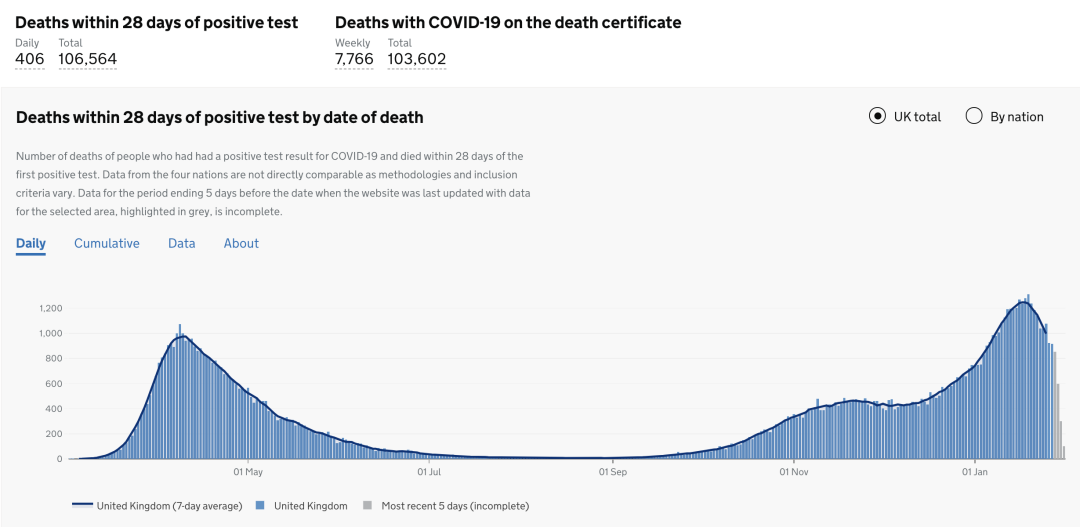 截止至2021年2月1日(周一)英国时间09:00,累计检测结果量70,340,312次(+574,012);累计确诊3,835,783例(+18,607);累计病亡106,564例(+406)。