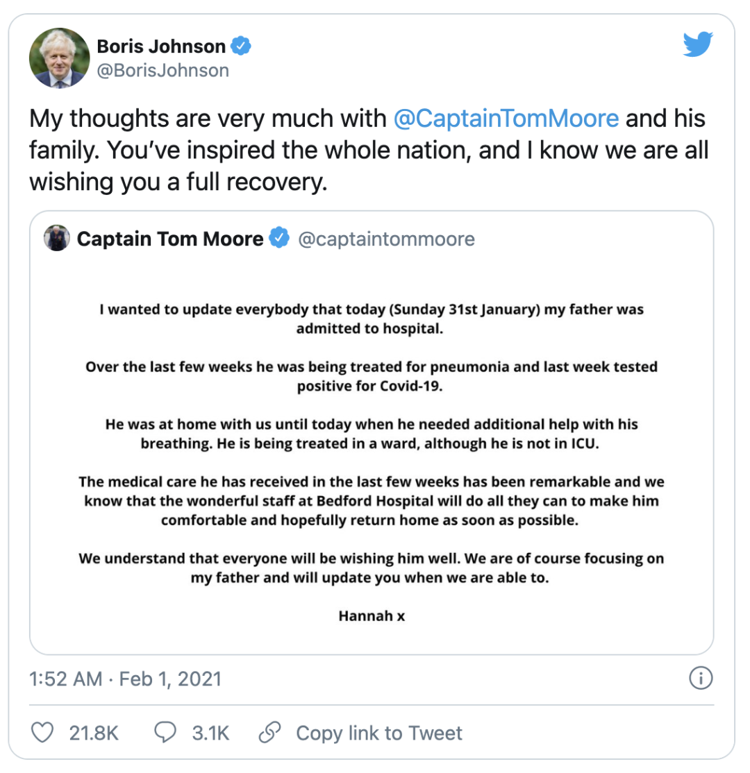 首相鲍里斯Boris Johnson也在推特上表示:我非常同情Tom Moore上尉和他的家人——你激励了我们整个国家,我知道所有人都希望你能早日完全康复!