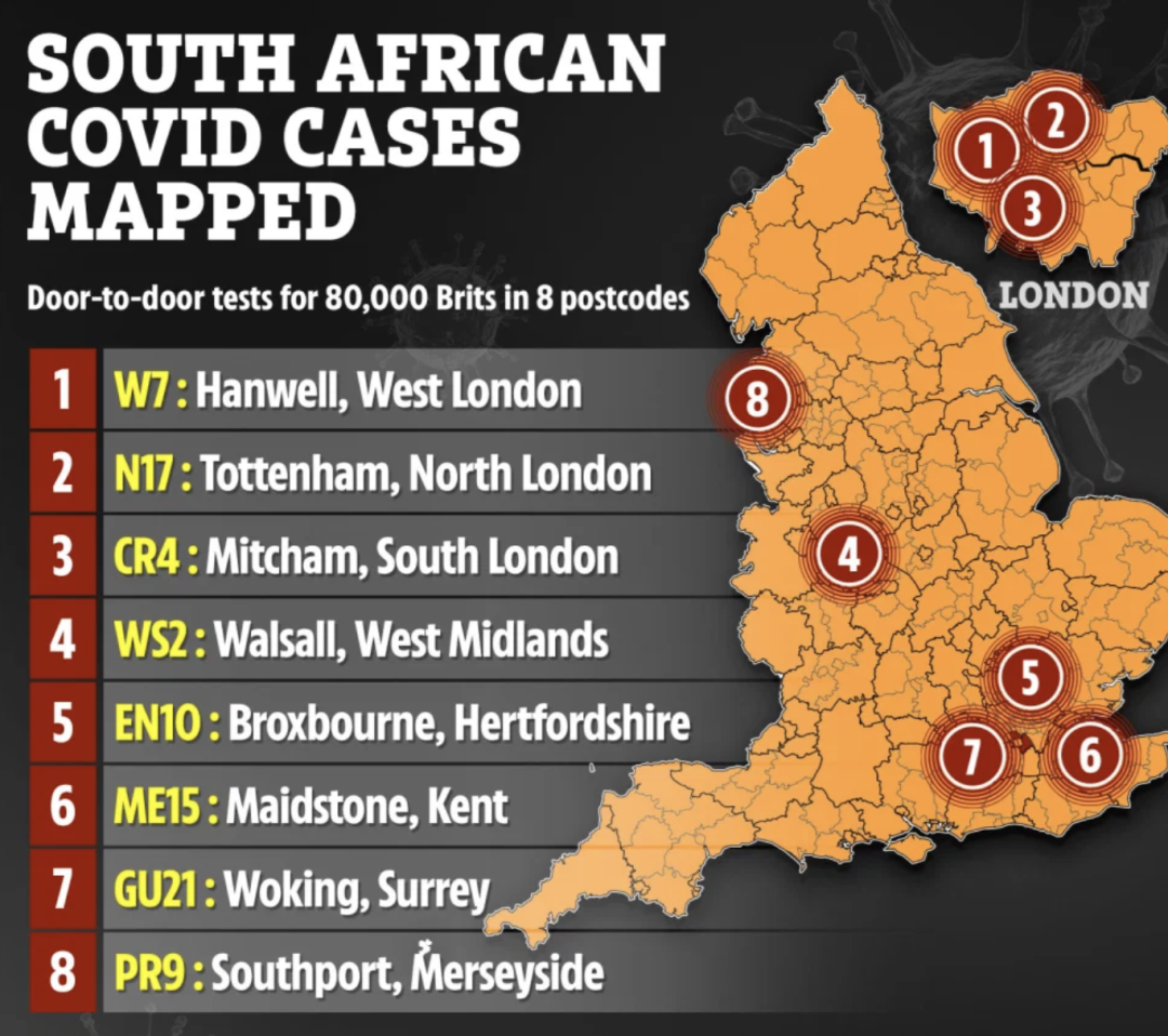 英国8个邮编地区已发现南非新冠变种、开始上门检测