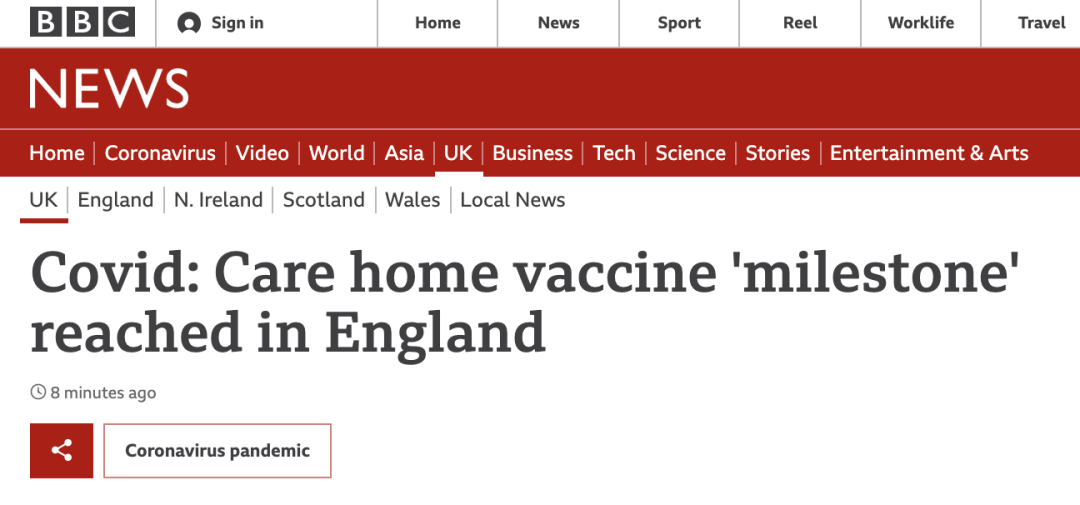 2月1日(周一),NHS英格兰宣布,英格兰所有符合条件的护理/养老院的年居民都已经接种了首针新冠疫苗。首相鲍里斯Boris Johnson将这一成就描述为一个「重要的里程碑」。