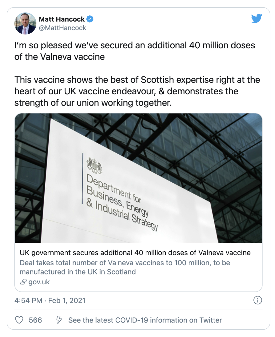 与此同时,英国已经从法国制药公司Valneva订购了额外的4,000万剂疫苗,该疫苗将在今年晚些时候进入英国境内开始接种工作。