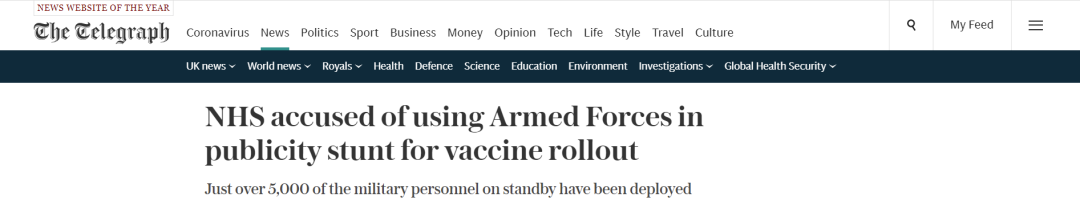 据Telegraph报道,NHS被指责把武装部队作为"宣传噱头",因为计划范围内的军事人员有一半并没有参与疫苗接种计划。