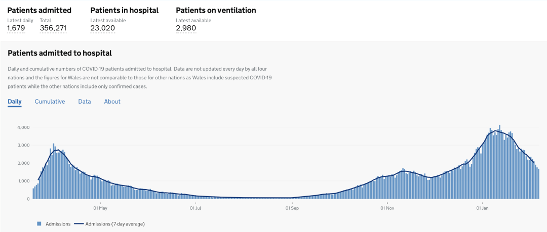 英国全境截至今日,已接种第1剂疫苗共12,646,486人(+352,480);已接种第2剂疫苗共516,392人(+3,811)。