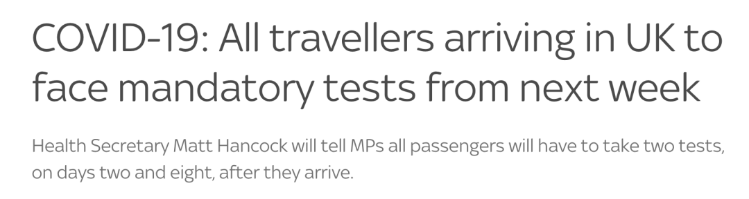 英国卫生大臣Matt Hancock准备在下议院的一份声明中宣布:从下周一(2月15日)开始,所有抵达英国的旅客都必须在抵达后的第2天和第8天进行新冠病毒检测。