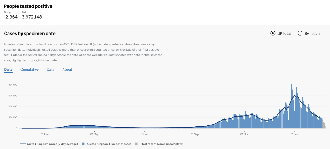 截止至2021年2月9日(周二)英国时间09:00,累计检测结果量75,693,515次(+616,718);累计确诊3,972,148例(+12,364);累计病亡113,850例(+1,052)。