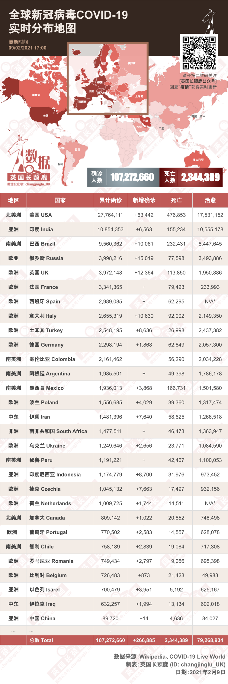 世界的累计确诊人数截止2月9日17:00超过10,727万例(+390k),死亡超过234.4万例(+12k)。