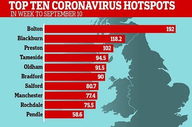 9月10日至的7日内,前十英国疫情严重区域