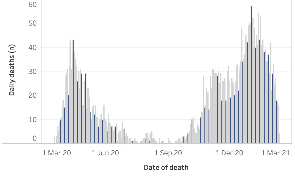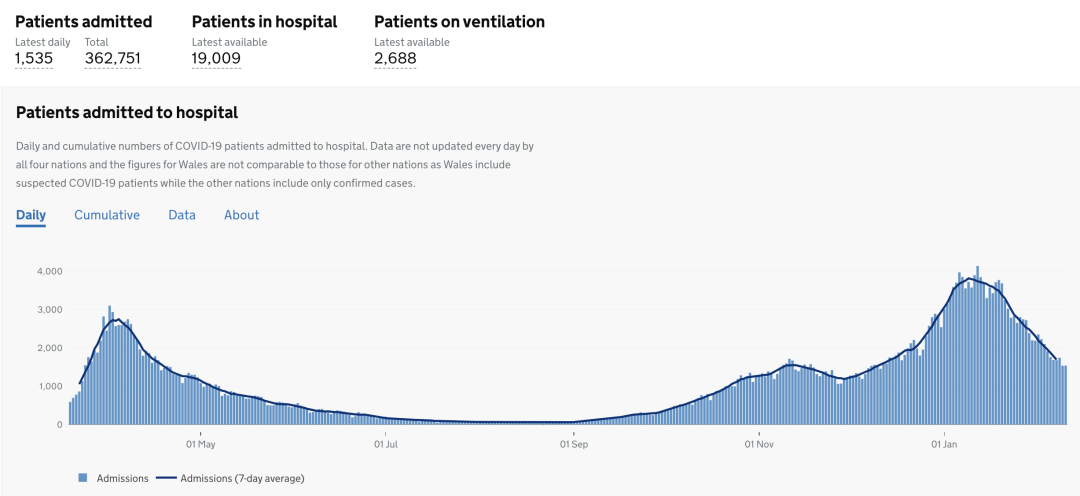 英国全境截至今日,已接种第1剂疫苗共14,556,827人(+544,603);已接种第2剂疫苗共534,869人(+4,775)。