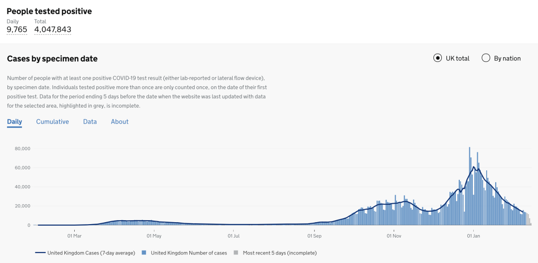 截止至2021年2月15日(周一)英国时间09:00,累计检测结果量79,338,077次(+401,786);累计确诊4,047,843例(+9,765);累计病亡117,396例(+230)。