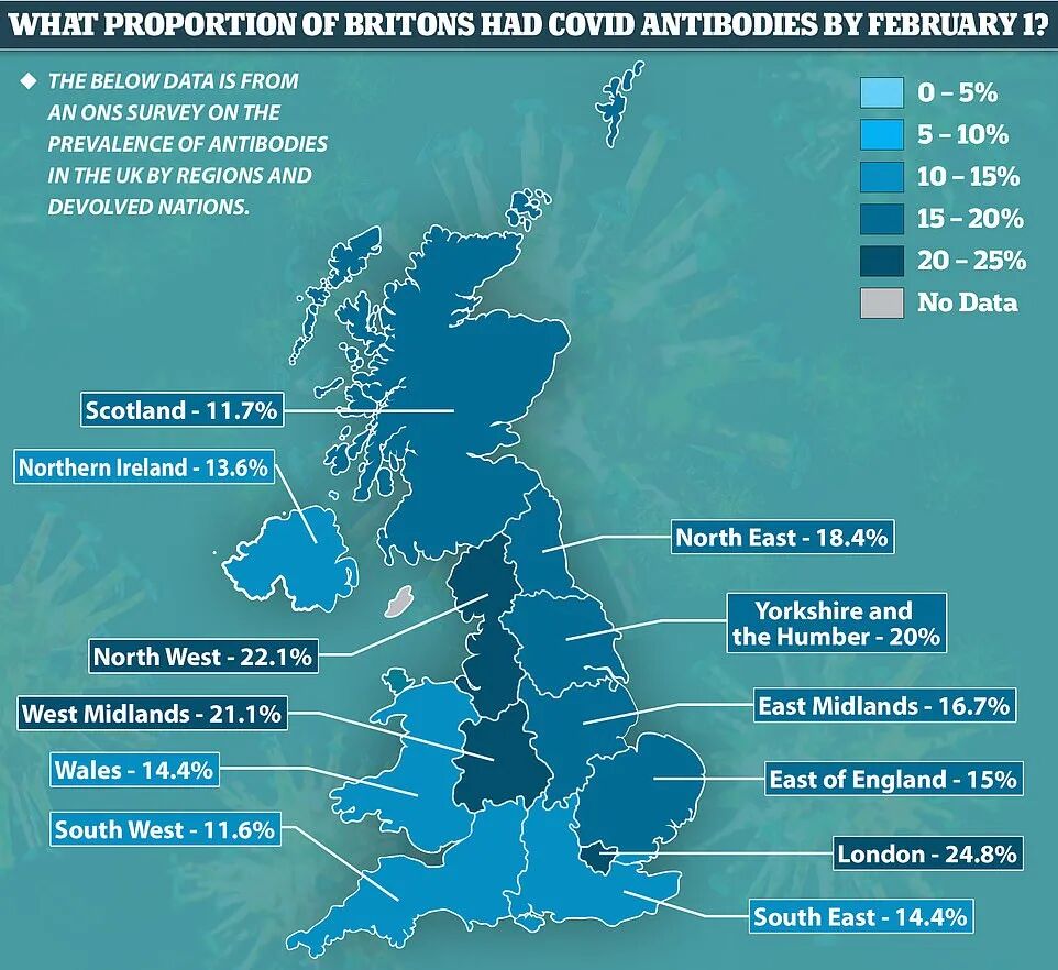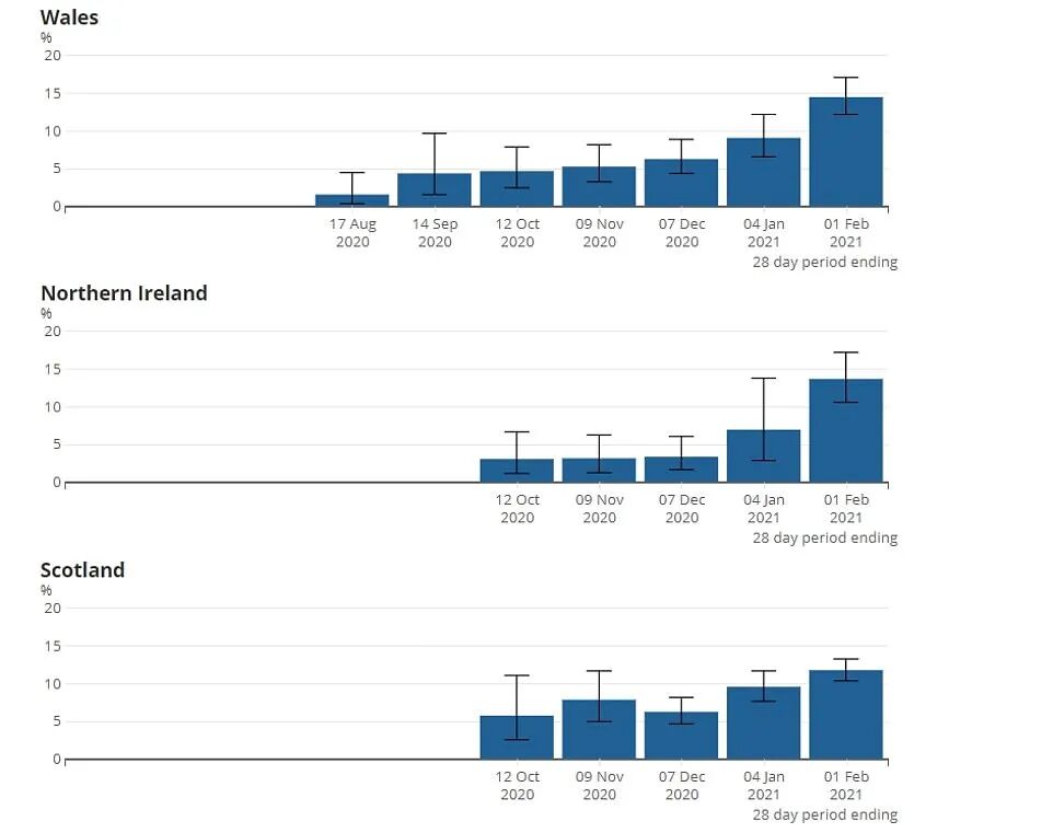 英国全境截至今日,已接种第1剂疫苗共15,576,107人(+275,956);已接种第2剂疫苗共546,165人(+6,535)。