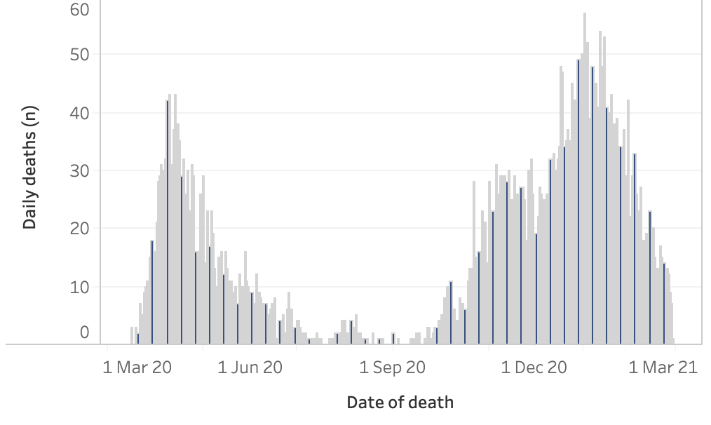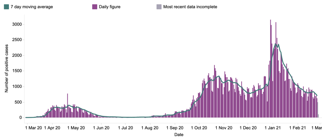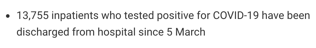 从3月5日以来,苏格兰地区一共有13,755名(+26)确诊患者出院。截至2月28日午夜,近期住院的疑似/确诊新冠患者共837名(-61),其中78名(+4)确诊新冠在重症监护室ICU。