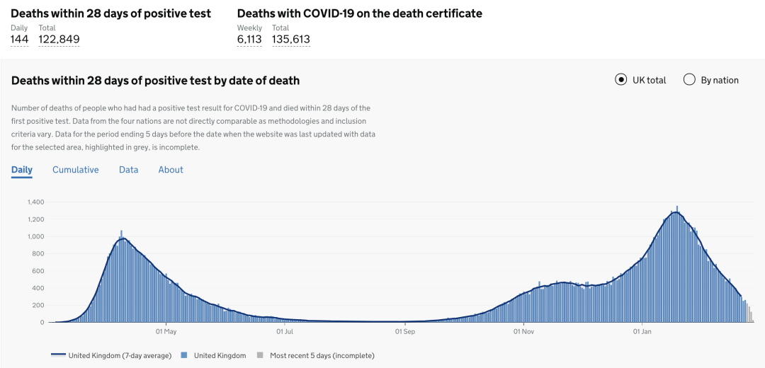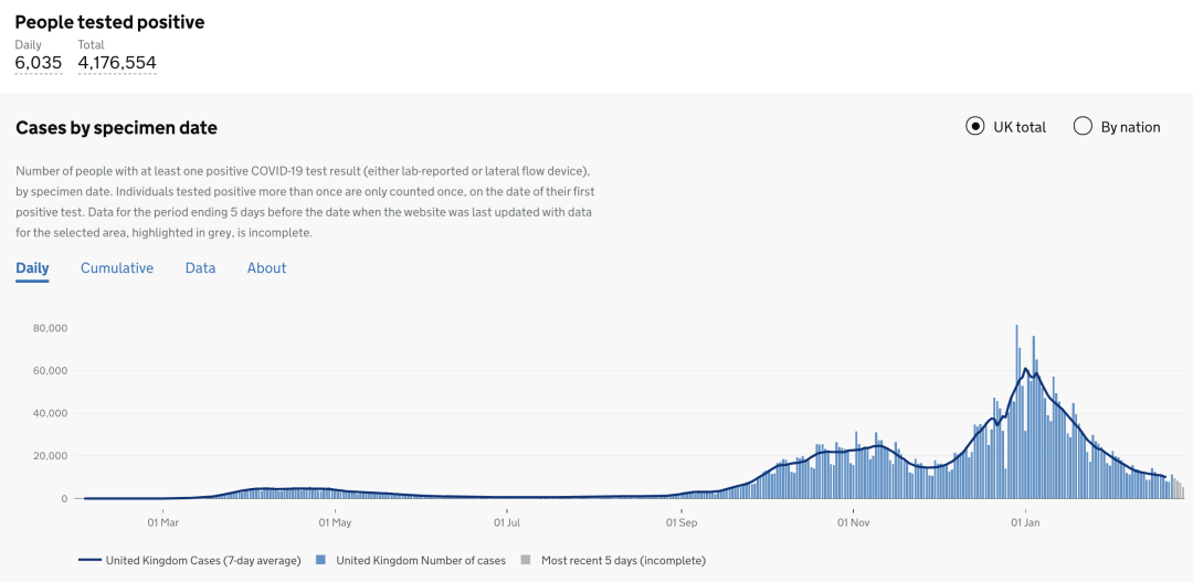 截止至2021年2月28日(周日)英国时间09:00,累计检测结果量85,925,041次(待更新);累计确诊4,176,554例(+6,035);累计病亡122,849例(+144)。