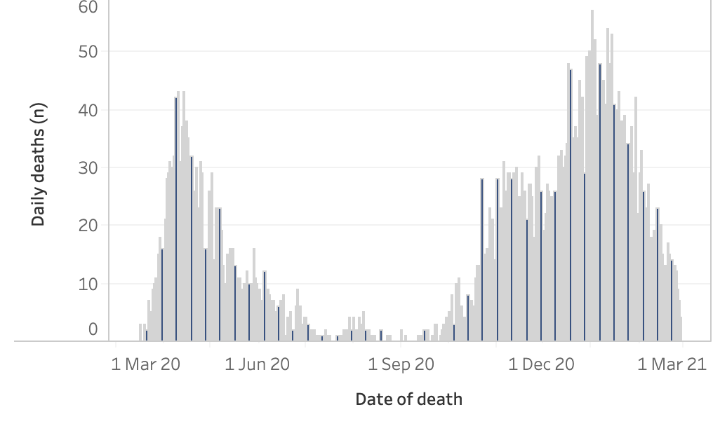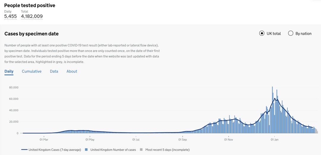 截止至2021年3月1日(周一)英国时间09:00,累计检测结果量87,496,888次(+526,679);累计确诊4,182,009例(+5,455);累计病亡122,953例(+104)。