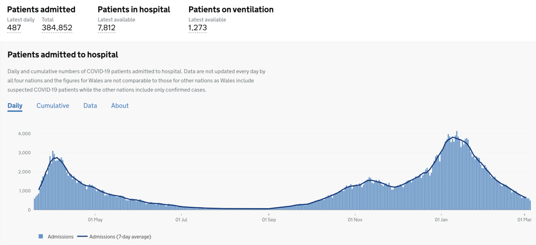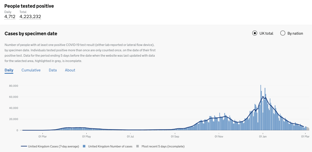 政府还表示,截至周一上午9时,英国新增4,712例确诊,这是自去年9月以来最低——过去7天,新冠的死亡人数下降了34.8%,而新增确诊下降了31.3%。