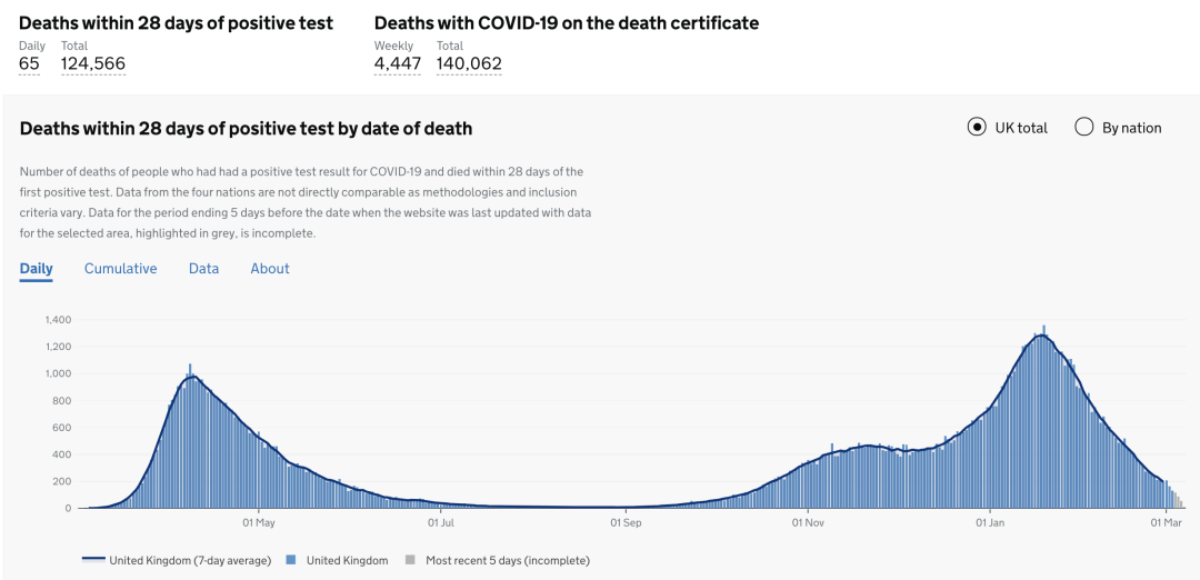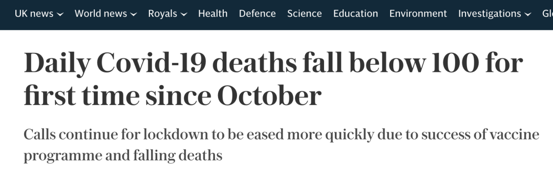 据悉,3月7日(周日),英国的单日新增病亡人数跌破100——至82人,这是10月9日以来首次低于100人;这也是第二波疫情中首次出现一天内死亡人数不足100人的情况。