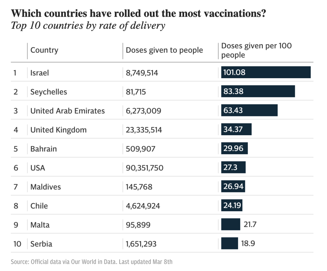 除了以色列以外,塞舌尔(83.38%)以及阿联酋(63.43%)的疫苗接种率也非常高。